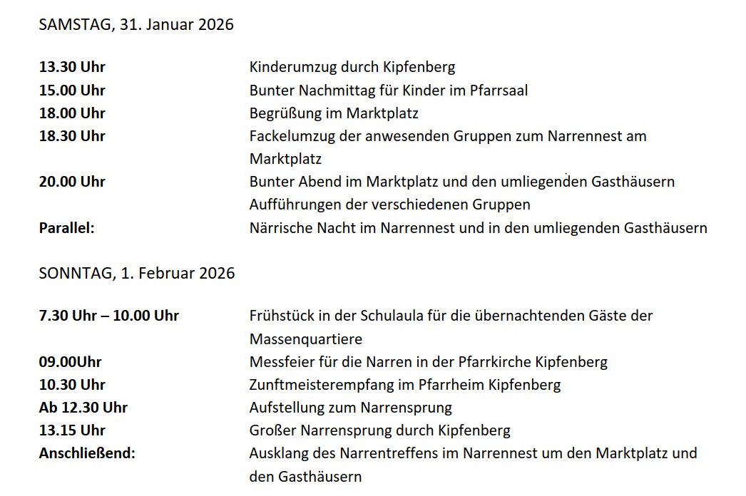 Nach 8 Jahren ist es wieder soweit: Am Samstag, den 31. Januar, und am Sonntag, den 1. Februar 2026, findet erneut unser großes Narrentreffen statt. Bereits zum 5. Mal richtet der Kulturverein e. V. „Die Fasenickl“ ein Narrentreffen in Kipfenberg aus. Unter dem Motto „Von Narren für Narren“ möchten wir Euch recht herzlich zum geografischen Mittelpunkt Bayerns ins Altmühltal einladen. Mit einer Mischung aus Tradition und Moderne ist bei uns sowohl für Jung als auch Alt viel geboten. Wir möchten den vielen Narren und Besuchern zwei unvergessliche Tage in Kipfenberg bieten.