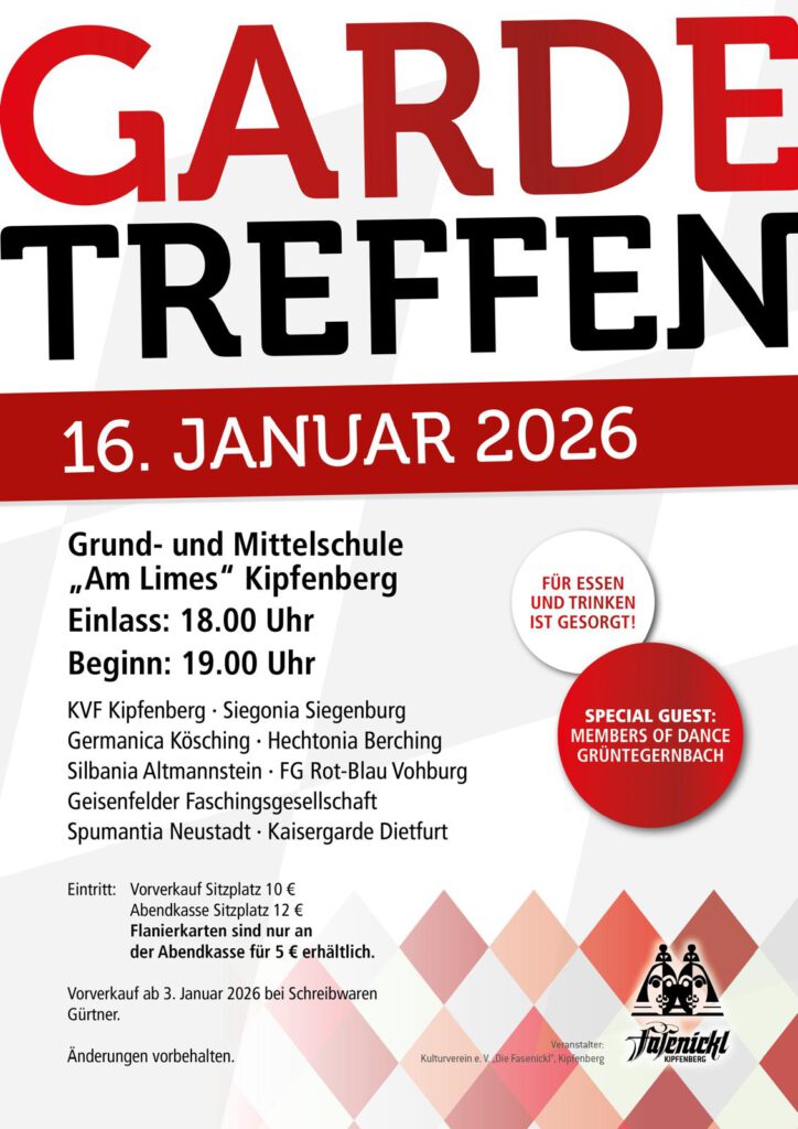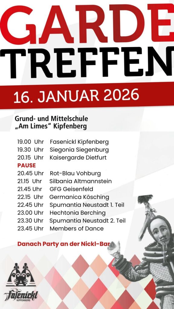 Am Freitag am 16. Januar 2026 findet wieder unser traditionelles Gardetreffen in der Kipfenberger Turnhalle mit zahlreichen Gruppen von Nah und Fern statt. Karten gibt es ab 3. Januar wie immer beim Schreibwaren Gürtner in Kipfenberg 🎫. Wir freuen uns euch als Gäste begrüßen zu dürfen ☺️🎉