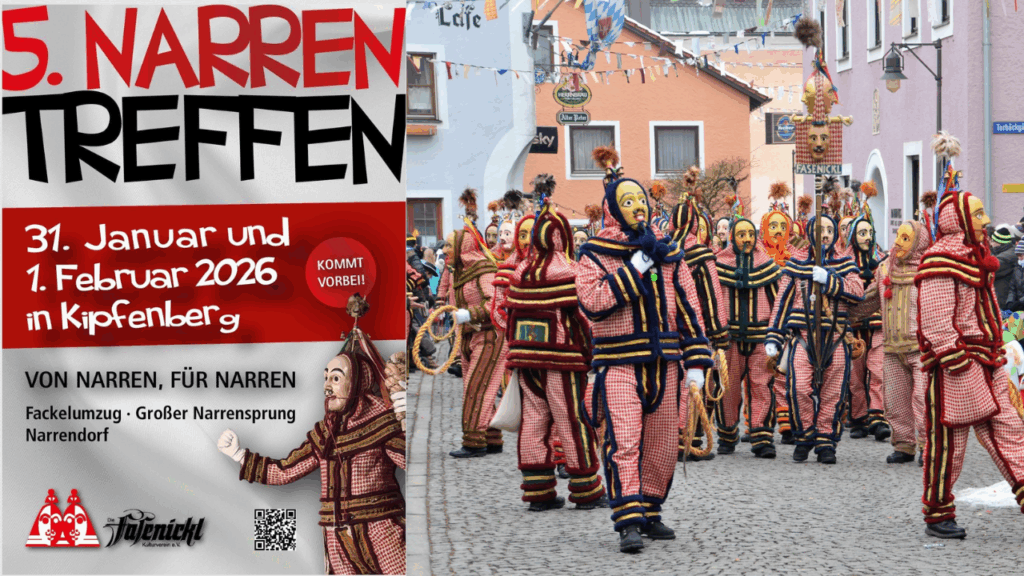 Nach 8 Jahren ist es wieder soweit: Am Samstag, den 31. Januar, und am Sonntag, den 1. Februar 2026, findet erneut unser großes Narrentreffen statt. Bereits zum 5. Mal richtet der Kulturverein e. V. „Die Fasenickl“ ein Narrentreffen in Kipfenberg aus. Unter dem Motto „Von Narren für Narren“ möchten wir Euch recht herzlich zum geografischen Mittelpunkt Bayerns ins Altmühltal einladen. Mit einer Mischung aus Tradition und Moderne ist bei uns sowohl für Jung als auch Alt viel geboten. Wir möchten den vielen Narren und Besuchern zwei unvergessliche Tage in Kipfenberg bieten.